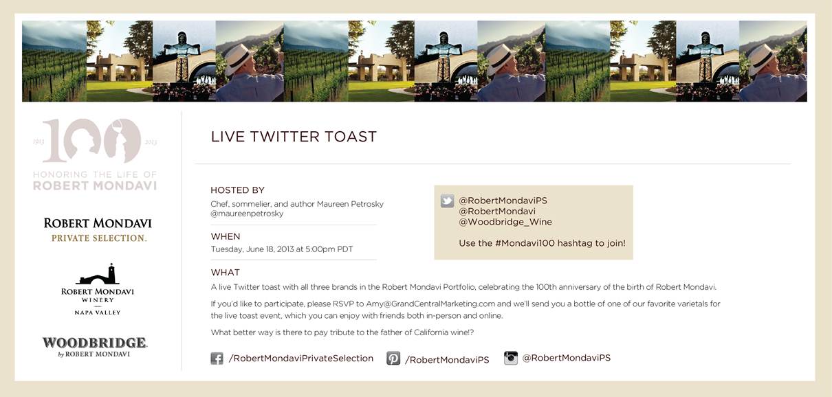 Today Tuesday June 18, 2013, at 5pm Pacific Standard Time, join me and other wine lovers around the world in a toast of appreciation for the leadership in the wine industry of Robert Mondavi.