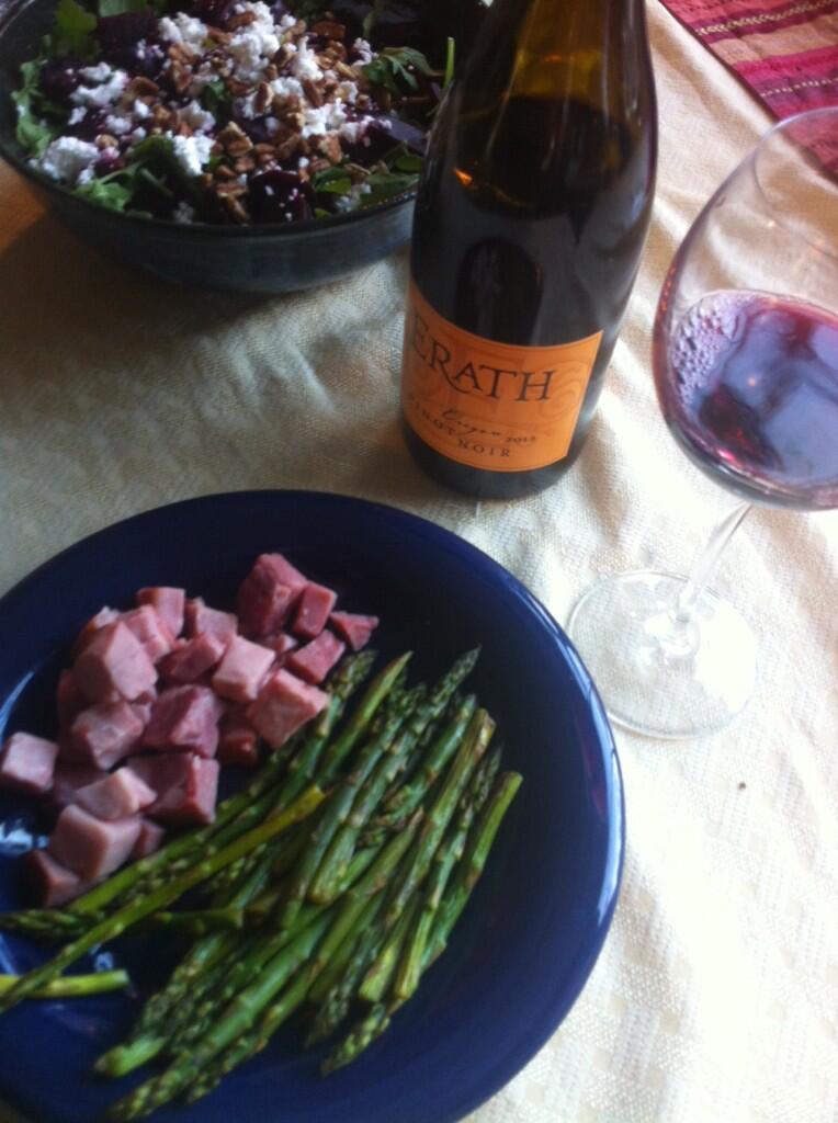 NOSE is fresh red berries like strawberries, cranberries and huckleberries, raspberries and some white stone fruit too. On the palate, we found tart cherry, juicy fruit gum, and cocoa nibs on the finish. With an easy open Stelvin closure and 13.5% alcohol, this is a very versatile wine that went well with everything that we tried it with (well maybe not the asparagus unless you had a nice chunk of ham after it!) You might not expect it, but this wine went quite well with the earthy beet, goat cheese, and arugala salad.