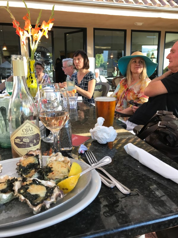 Then I bought a bottle of the nice cold Rose to take down the street to Sea Fresh where I joined my friends for happy hour! Many of the Ojai restaurants waive the corkage for local wineries which Sea Fresh did for this bottle which paired so well with these oysters Rockefeller!