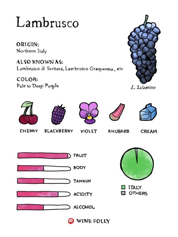 Wikipedia says that “Lambrusco is a brightly colored grape variety used to make sparkling red wines in Emilia-Romagna, northern Italy. More accurately, it is a collective term for a group of grape varieties (much like Muscat) – more than 60 Lambrusco varieties have been identified so far. “