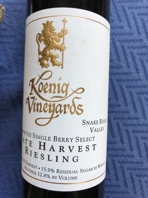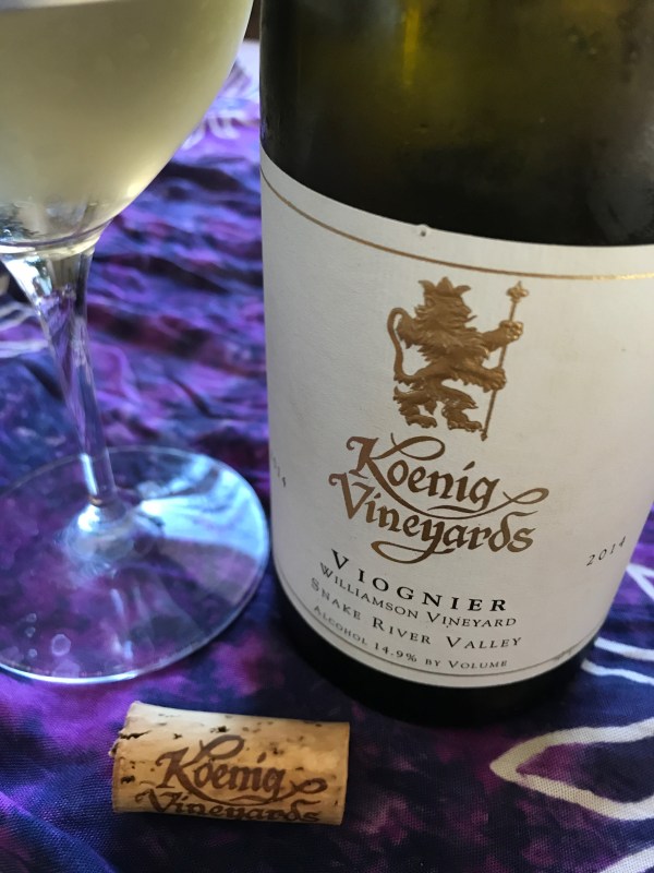 In our on-going series on wine from Idaho, today, the final day of June’s Idaho Wine Month, we’re featuring two wines from Koenig which Sue visited last summer. While Sue is typically a red wine gal, this is the second Viognier she bought on her trip there (see our notes about Williamson’s Viognier here). The 2014 Koenig late harvest riesling was sent as part of a case of twelve wines from 12 wineries.