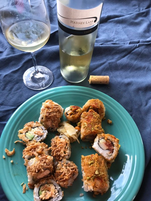 Spicy sushi from Sprouts tames the acidity and brings out pear notes in the Harney Lane Albarino; I really liked this fun easy pairing!
