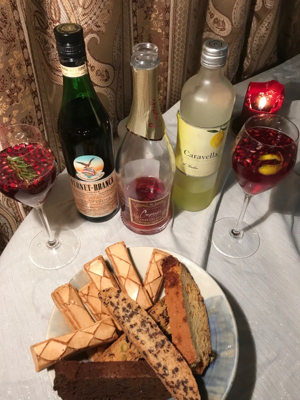 definitely try this wine with pomegranate seeds, limoncello, and a twist of lemon peel…We also mixed pomegranate seeds, Fernet, and this sparkling red wine with a garnish of rosemary for another really nice holiday sparkling cocktail.