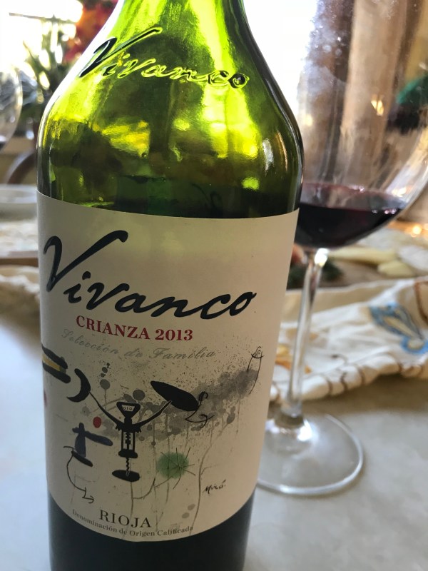 We wondered if the labels feature modern Spanish Artists. Then we discovered from the description on the back that Joan Miro’s “le troubadour” from 1974 inspired the wine label. I really love this table with the corkscrew person at the center of the balancing act depicted — and that balance reflects the wine too!.