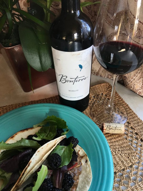 Taco Tuesday: pair the merlot with chicken mole tacos with fresh berries and greens