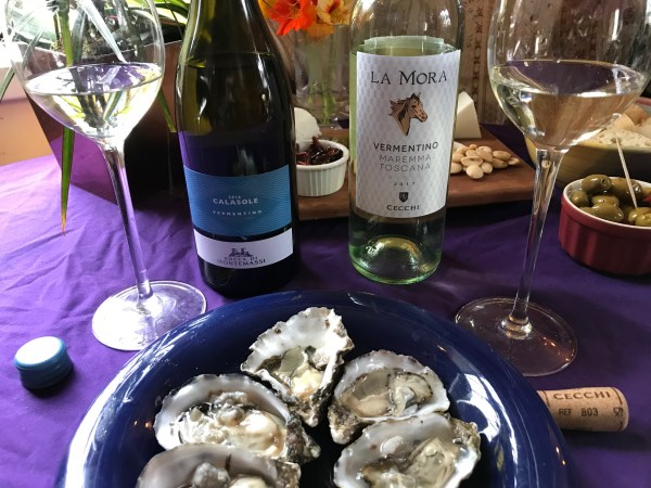 For this month’s Italian Food Wine and Travel investigation into Vermentino, a crisp, acidic, white wine commonly found in the Italian regions of Liguria, Sardinia and Tuscany, we focused on two from Tuscany and discovered that while the same grape and region they had two equally pleasant and completely different flavor profiles yet both paired wonderfully with our meal of oysters, lemony caesar salad chockfull of salty anchovies and parmesan, fried calamari, and pasta carbonara. And they offer a great value! Scroll on down to see what others drank and ate!