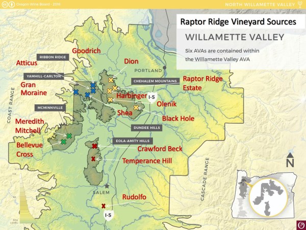 According to the winery, “Raptor Ridge has been sourcing fruit from Dick and Dierdre Shea since the 1996 vintage, making us one of the longest running producers of Shea Pinot Noir in the Willamette Valley. The vineyard is located north of highway 240, between the town of Yamhill and the Chehalem river valley. In the early days, we sourced own-rooted Pommard and Wadenswil from the original 1989 plantings; these days, after working with several parcels, we’ve settled on Block 11, providing us 115 and 777 clones of Pinot Noir. Shea is a perennially warm site, giving surprising richness and texture in cool years, and muscle and opulence in warmer ones. Shea’s fruit profile is highly typical of the larger Yamhill-Carlton AVA – brambly red and black berry fruit, with a loamy complexity and notes of licorice.”