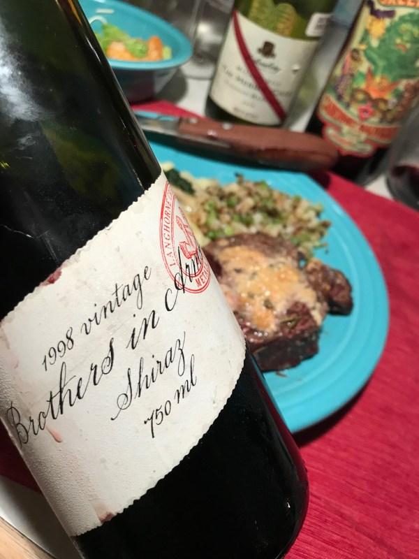 When I found out I was going to be hosting this month’s Wine Pairing Weekend excursion to the Land Down Under, I knew what wines I wanted to open — a 1998 Brothers in Arms Shiraz from Langhorne Creek in South Australia. Sue was surprised to discover that I had in my stash a bottle of 1998 Shiraz — but even more surprised that I wanted to also open a 2005 bottle of Napa Valley Cabernet Sauvignon –even if it was made by the famous Australian winemaker Chris Ringland.