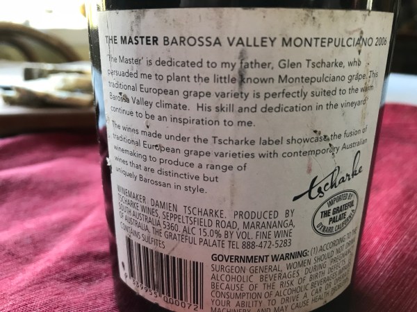 The last of the last. This is it, the last bottle that I bought from a Grateful Palate Warehouse sale, one that was first tucked away in my grandfather’s wine cellar, and then tucked away in my own: a 2006 Montepulciano from Tscharke.