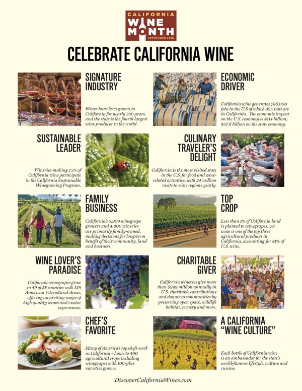 Why celebrate California wine? Among the many reasons, Discover California wines points out that wine is a signature industry, an economic driver, a sustainable leader, a culinary delight, a family business, a top crop,