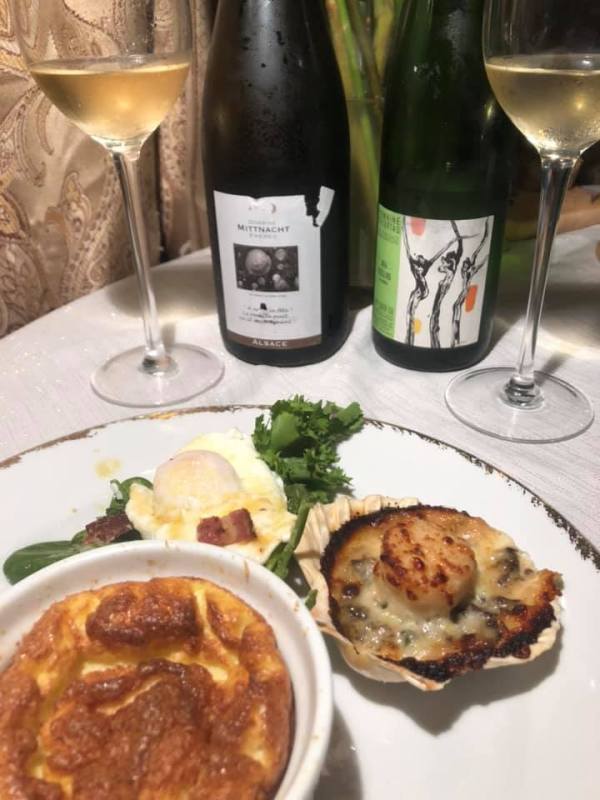 At lunch we had their Chardonnay and I was able to taste one of the experimental bottles of sparkling wine — very dry and with lovely strawberry and raspberry fruit and a bit of fun funk too. (At the end of the day, as a thank you, Bruce offered to me a bottle of wine; of course I asked for the sparkling! He seemed surprised and warned me that it’s an experiment and he’s not sure whether it will have bubbles or be flat which makes it even more exciting to me and to share with Sue).