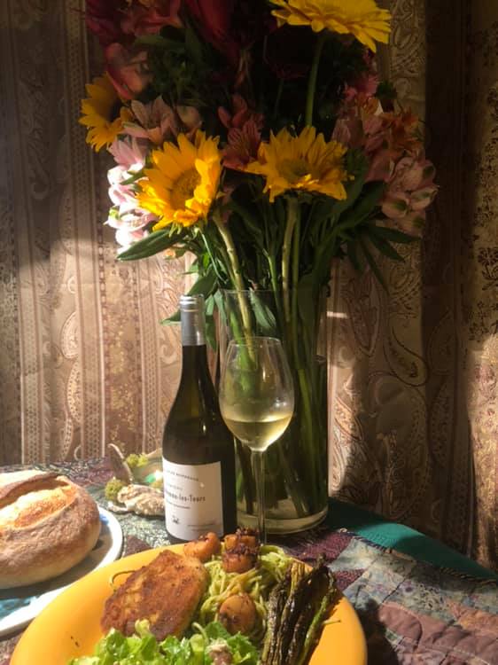 Pairing: I loved it with the goat cheese and sourdough, and it was fantastic with our provincial olive taponade. It was wonderful with caesar salad and we could imagine it would be nice with a classic salad topped with a lemon vinaigrette. It also went nicely with goat cheese or brie topped with pear. Excellent with scallops cooked in butter, garlic and herbs on a bed of capalini pasta with nasturtium pasta and really very good with the Calamari. It liked the rich seafoods.