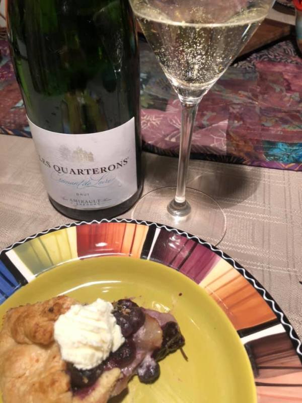 - Pairing: Really likes the richness and sweetness of the crab dip. So nice with the goat cheese and the jasmine confit. The wine was beautiful with a simple toasted almond. Sue could imagine this wine with a trout almondine which is not surprising as this is a dish from the region. Paired well with simple green salad (that we added the leftover cherry tomatoes on rosemary skewers with added crunch from a blend of roasted nuts with red pepper flakes), and even better with roasted pumpkin soup. Refreshing with a dessert of a pear and blueberry galette.