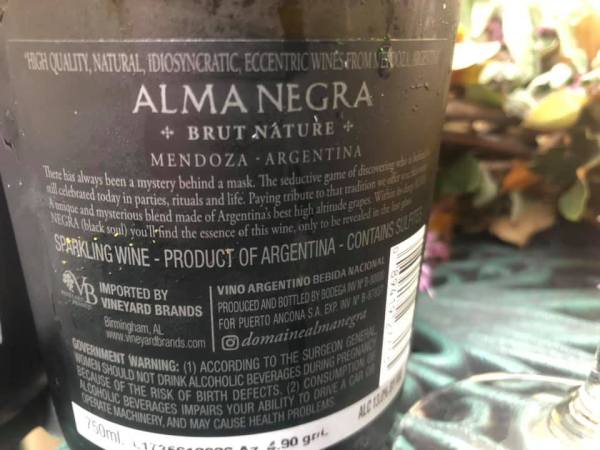 But since it is from Argentina, According to the tech sheet I found on the Vineyard Brands website, Alma Negra is a blend of Malbec and Pinot Noir! The grapes come from two elevations in Mendoza: Vistaflores, Tunuyán at 3,608 feet and Gualtallary, Tupungato at 4,265 feet. The wine spent eight months on lees and then secondary fermentation under crown cap. While the RS is 4.5, the PH is 3.2.