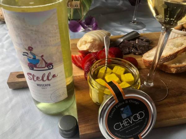 Pairing: We both felt that this was a nice cocktail wine. As we were talking about the wine, we imagined how well it would go with apple pie for a dessert pairing or a cheese danish for brunch. The fat in the St. Angel cheese tames the sweetness and brings out orange in the wine. When adding a strawberry on top it wasn’t as great as the cheese alone. Fantastic with our Chevoo marinated goat cheese with fennel pollen and orange. This would go well with Asian orange chicken takeout. This wine is so much better with food! It was just so so with our chocolate almond and dried cherry bark. This wine really liked the rich salty qualities of the cashews, making us think of Asian cashew chicken. Great Chinese take out wine for a mid-week date night!