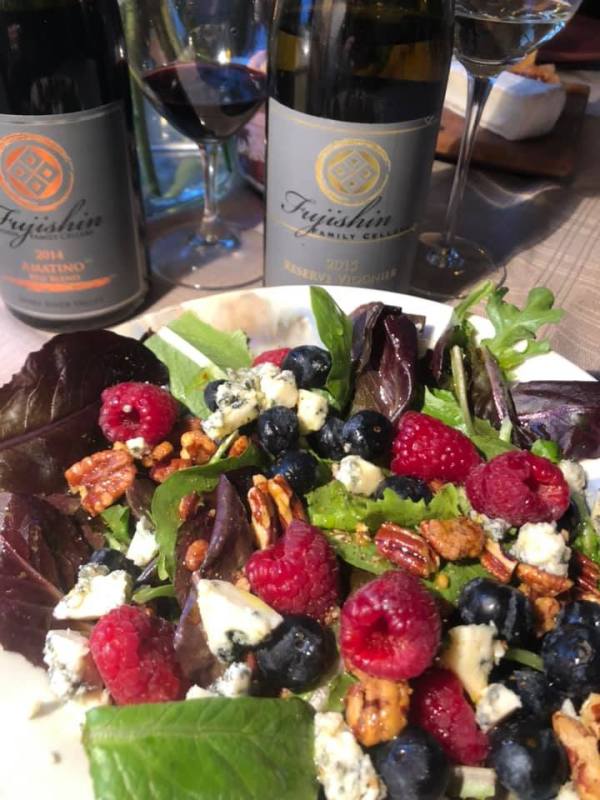 Fresh greens topped with raspberries, blueberries, Point Reyes blue cheese, spiced pecans from Great Basin Bakery, orange olive oil and rose vinegar.