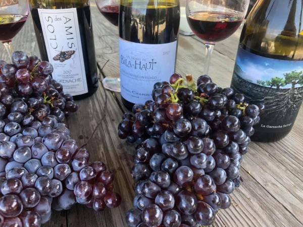Clos des Amis owners and winemakers Bruce Freeman and Gretel Mays Compton and I celebrated Grenache Day by opening and tasting three bottles of grenache/garnacha: a 2017 from California’s Clos des Amis (of course!), plus a garnacha from old vines in Spain, and a grenache blend from France. Unlike our usual wine pairing extravaganzas, we tasted the wines outdoors at the picnic table near the crush pad under the pepper, then later that weekend paired them with lamb chops grilled with lots of garlic and rosemary.