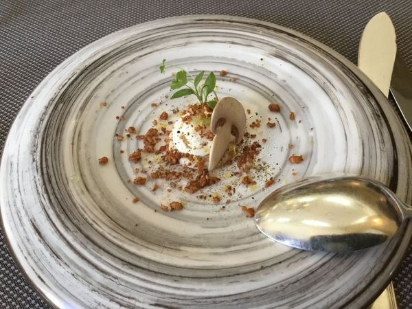 Local goat cheese and local mushroom topped with toasted grains. It was so hard not to lick the plate! photo and comments by Sue Hill