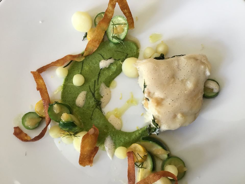 Monk fish on with baby potatoes and zucchini, the monk fish was prepared in parchment with lime zest and herbs. The green smear on the plate was a zucchini purée, and the cream sauce on top of the fish was to die for. Photo and commentary by Sue Hill