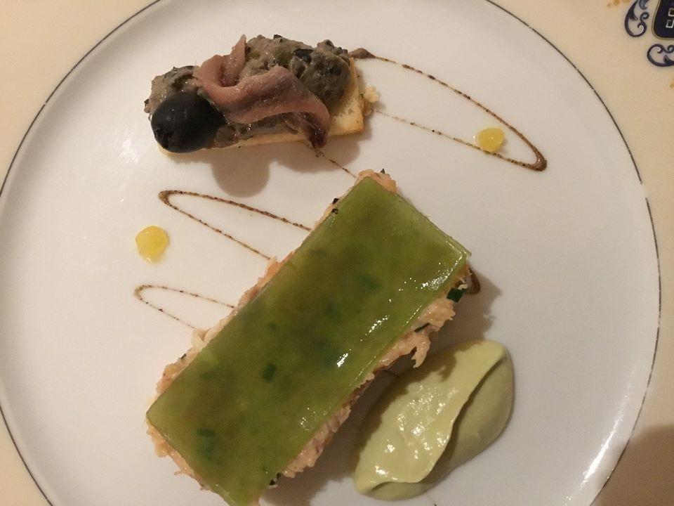 Crab and fish with herbed gelatin on top, avocado purée to the side. Olive tapenade with an anchovy on top dabs of a citron paste and spiced chocolate for aesthetic.