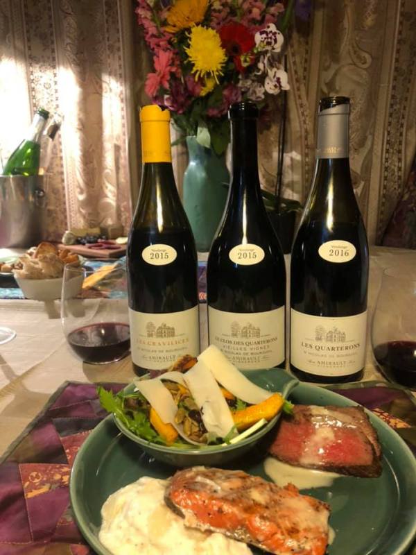 Pairing: Sue thought it was really nice with the blue cheese and walnuts, but I was not as excited. With food however, it is a game changer. Without food, I did not get this wine at home like I did in France. With the simple blue cheese and walnut crostini, it makes the wine rich and smooth. Great as well with the mushroom brie and pate. Surprising that is was so sweet with the pate. Light enough to handle the fish because the beurre blanc brings richness and complexity and takes the dish to another realm. Without a doubt that is the best tri-tip that I have ever had, so full of flavor, but with the wine, it was just an okay pairing until I added the beurre blanc because it has just too much vegetal characteristic for me, and I even thought it was better with the salmon. The squash in the salad is also fantastic with the Les Quarterons, and I could imagine Sue’s squash gratin dish with this wine which we wrote about before because squash and Cabernet Franc go so well together. With the Clafoutis there was a sweet tart element. Not so tart that you did not like it, but not sweet to conquer the person with a sweet tooth but successful for most others.