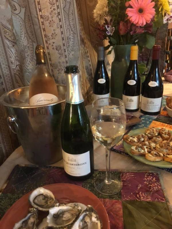 Pairing: I know we talk about sparkling wine and oysters all the time, however there is a reason for that. Lemon citrus in the wine meets the ocean breeze of the oyster and makes a perfect match. On the other side of the spectrum the blue cheese toasted walnut crostini also was a great match with the Les Quarterons, so very tasty. The fennel salami was beautiful as well. The herbal qualities in the salami made the wine shine. Super yummy with the Clafloutis dessert: the almond extract and almonds compliment the wine so well.