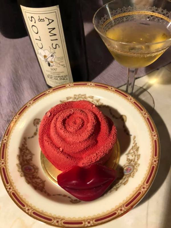 Pairing:  Sue loved this wine with a simple Italian almond madeline cookies, not too sweet and perfect savory and loving the almond flavoring. This rose shaped raspberry mousse cake likewise was not too sweet. And the chocolate lips? Well we shared the one three ways so that little nibble was just fine!