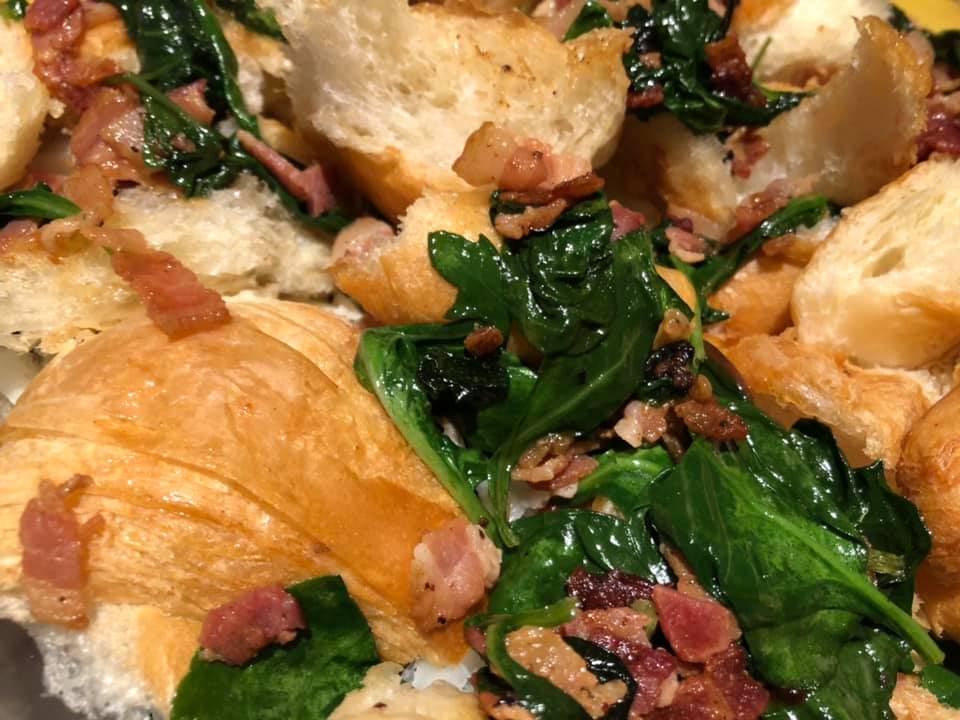layer the torn up bacon and sauteed spinach, then the cheese