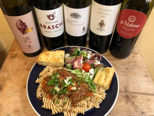 We paired these five sustainable Sangiovese samples with Sue’s home made bolognese, vegetarian ragu, caponata, tapenade and focaccia: