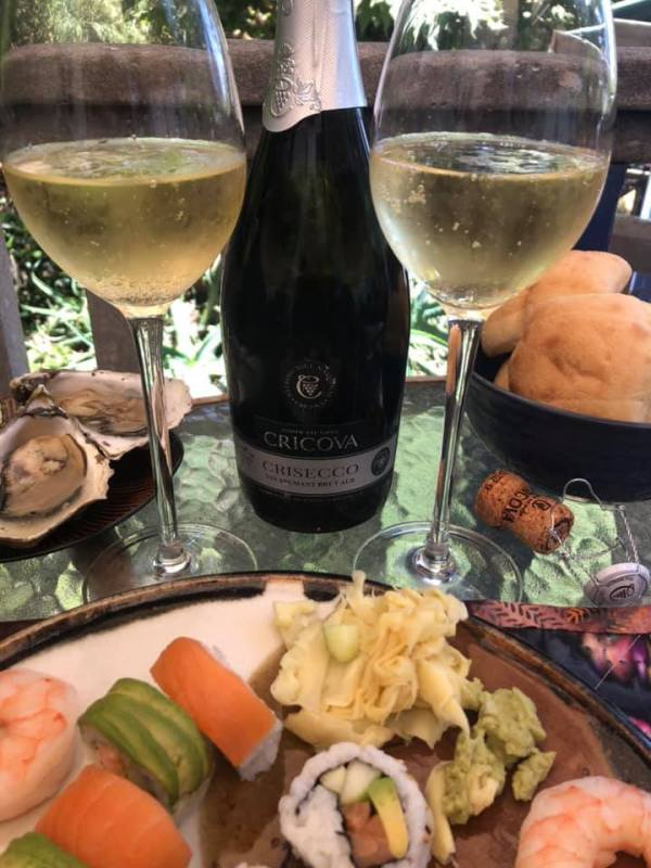 Pairing: Peach flavors when paired with oysters; the oyster brings out beautiful fruit profiles in the wine. Nice with the shrimp, and very nice with shrimp in the salad. Sue thought it would be very nice with egg rolls. While it was nice with a salmon sushi roll, I preferred it it with the salmon sushi where it brings out such peachy fruit in the wine. Tuna sushi however, brings out a lemon quality in the wine. Sue loved the wine with the ginger on the sushi plate. I didn’t believe it and had to try it for myself. She was right, it works so well we started imagining how to use the wine for a ginger infused cocktail. We always think of bubbles as being a great party wine and this is no exception. It is very food friendly. With the large pelage, it holds the bubbles for a while ensuring it continues to stay fresh for quite some time.