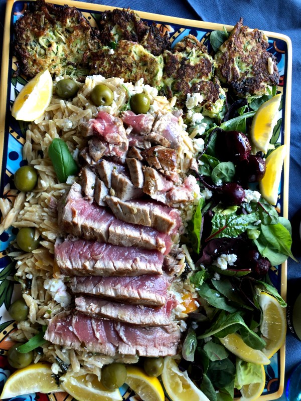 fresh grilled ahi tuna steaks and zucchini fritters on a bed of fresh tomato orzo and greens; recipe adapted by one developed by Nicole at Somm’s Table (link)