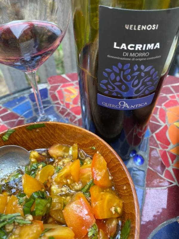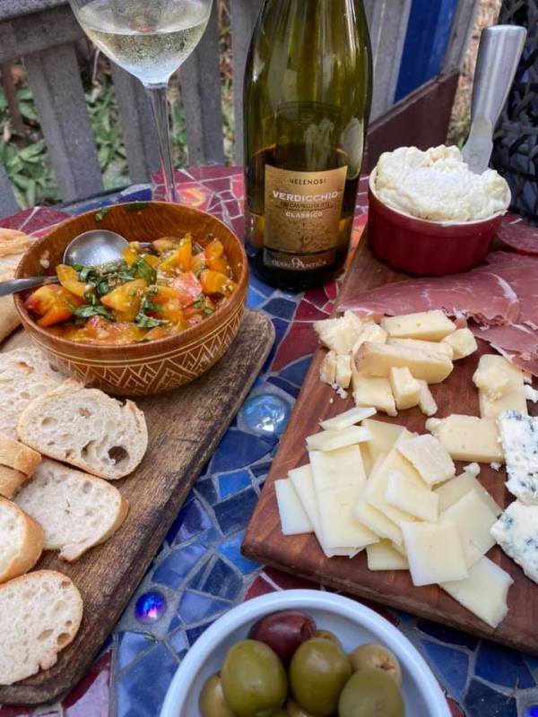 I was fortunate enough to score a spot in the Velenosi Vini at home virtual tasting led by Italian Wine Ambassador, the Italian Girl herself, Laura Donadoni. She was at home in San Diego, Thea Dwelle was in Sonoma, Liz Barret joined us from Chicago, Pinny Tam from New York, Teresa Nozick and Melanie Weber tasted from LA, I was at home in Ventura on my deck along with Sue Hill and Gretel Compton, and others joined us from their homes scattered across the US. Sue prepared bruschetta and a charcuterie plate, and later my spouse grilled up eggplant. Yum! I also sampled the wines with takeout from Ferraro’s Italian Restaurant –manicotti with meat sauce and salad with gorgonzola dressing.