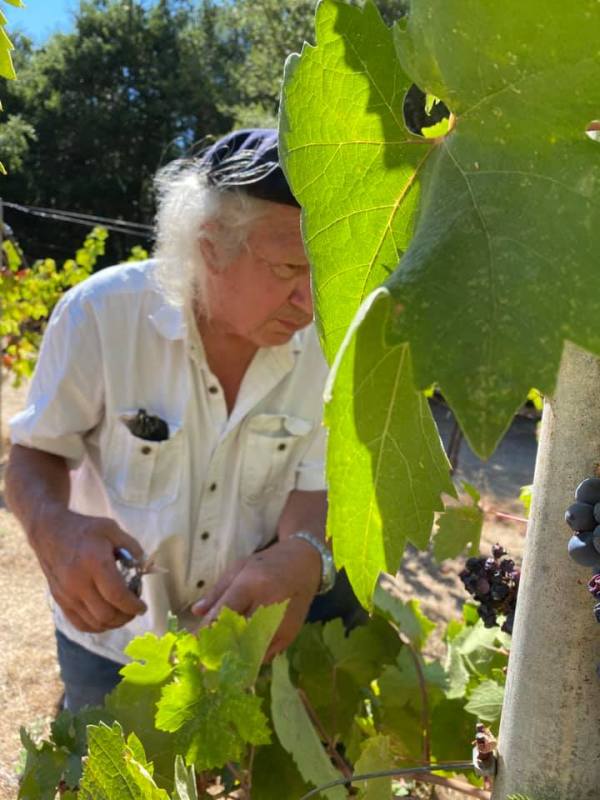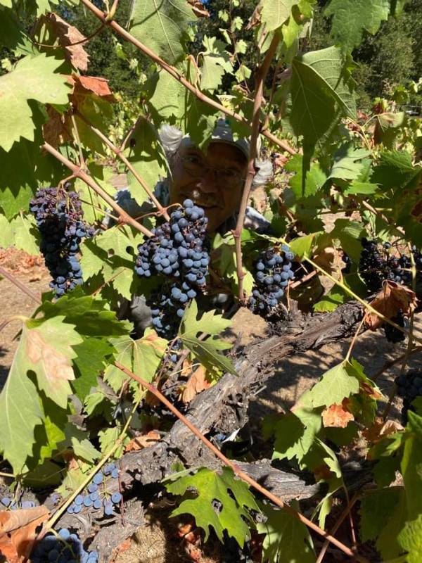 Not that the bees have gotten too much from this vineyard. These 30 year or more old vines are laden with lovely black fruit destined to become the first Zinfandel Bruce has made from this vineyard in 15 years, or so. At least so far this harvest there’s no sign of the powdery mildew which plagued last year’s vines; 2019 saw so much late spring and early summer rain followed by warm, foggy days, an ideal environment to cover the leaves in a white coating of spores that spread to the fruit destroying both.