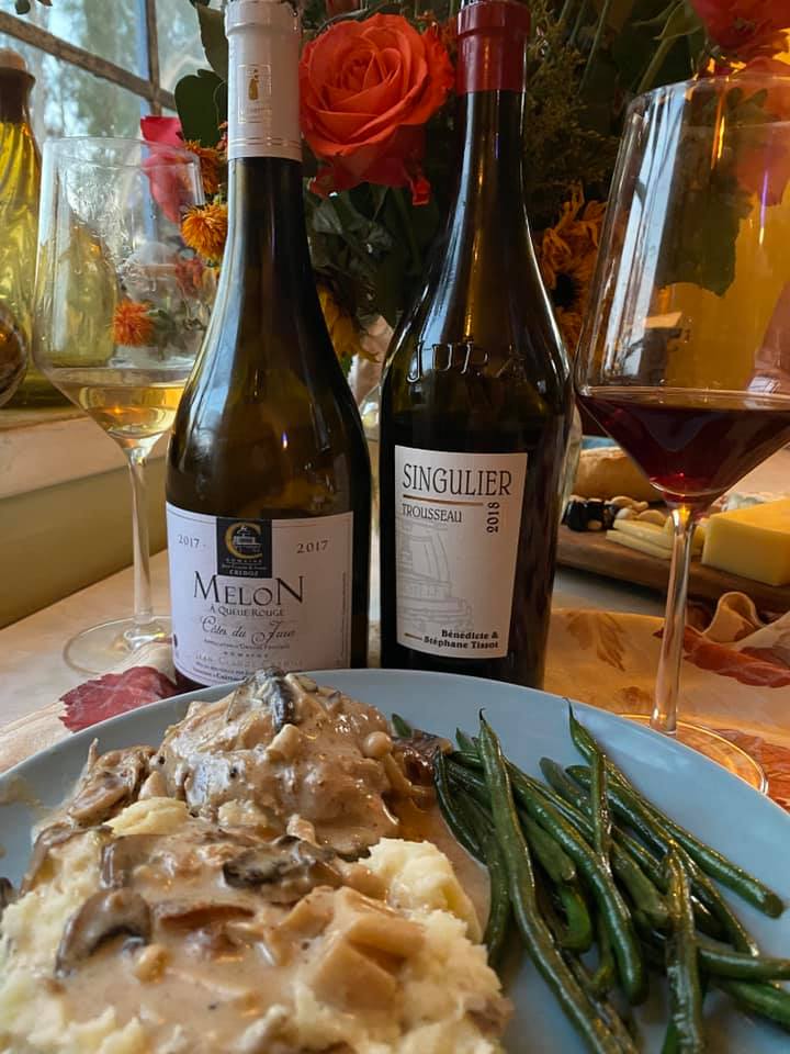Sue dredged the chicken in flour, fried in olive oil, braised with white wine, cream, mushrooms, cooked in a generous cup of 2017 Jean Claude Credoz Melon Cotes du Jura AOP and a dry white port as I was out of sherry. This is Sue’s version of a classic regional dish that cooked for several hours on a low heat on the stove. We used four kinds of mushrooms because we couldn’t find morels.