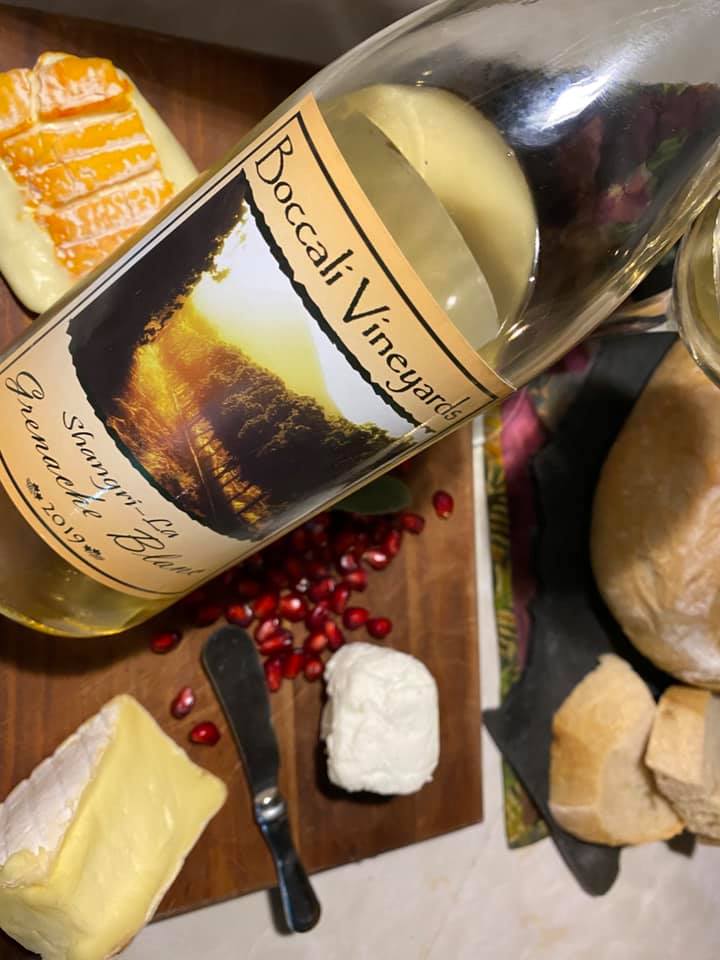St. Angel, French washed rind cheese, Port Salute, chèvre, pomegranate seeds; bread by Lauren Mosinka - 2019 Boccali Vineyards Shangri-La Grenache Blanc