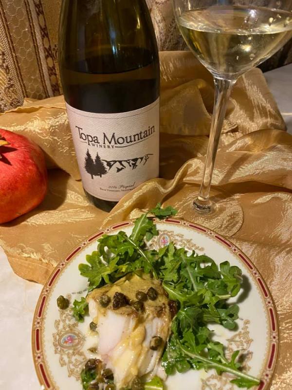 from Ventura Fresh Fish with capers, butter, lemon, and dijon mustard served over a bed of arugula with a lemon vinaigrette - 2016 Topa Mountain Winery Picpoul, Rich Vineyard