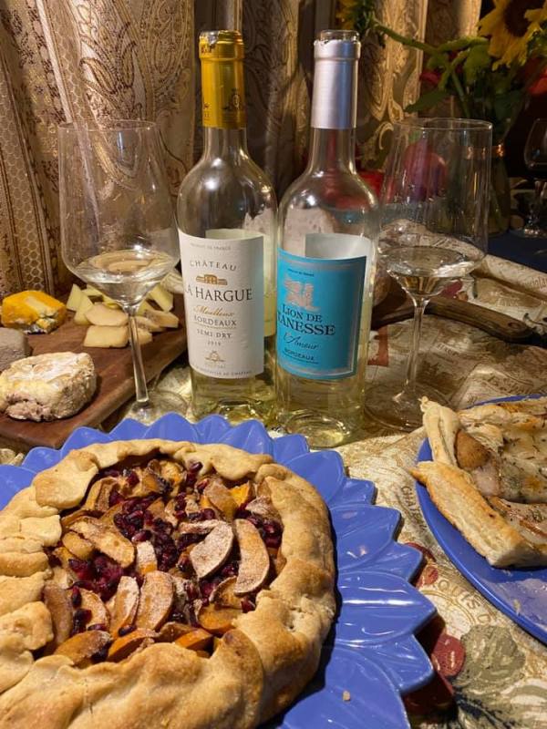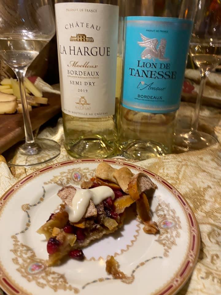 Shelia did not find the wine to have much of a finish, but with food the finish is there and compliments each other. The dessert was like a sweet tart pairing, but the pie crust was a bit too sweet. If the purchased pastry crust (from Trader Joe’s) was homemade without sugar, Sue thought it would have been better with the wine. The cooked fruit was perfectly sweet enough to go with the wine, however.