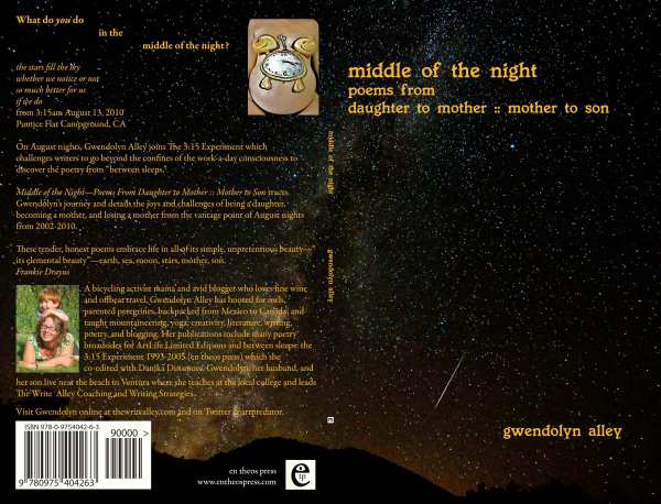 I started in journalism, earned a creative writing degree from UC Santa Cruz, and then began doing poetry as a grad student in English at the University of Nevada Reno. My publications include my poetry collection middle of the night: poems from daughter to mother :: mother to son, some three dozen poetry broadsides in Art/Life (a limited edition magazine sought, bought, and collected around the world), a co-edited collection (with Danika Dinsmore) between sleeps: the 315 experiment 1993-2005), plus two major public art poetry commissions, one in Pasadena and one in Santa Barbara.