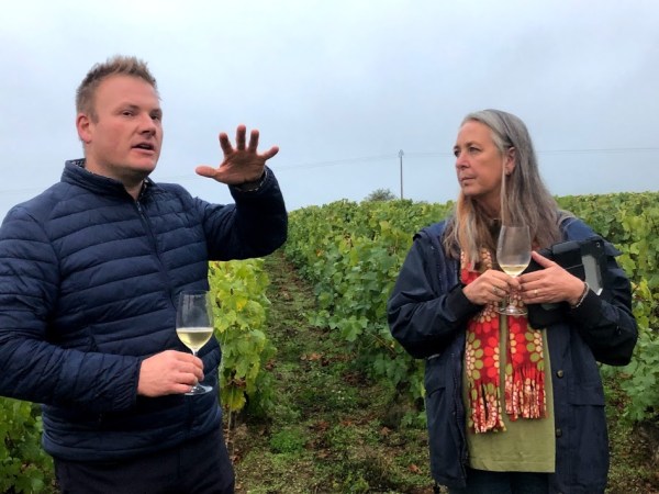 With a glass of his Champagne in his hand, Phillipe Lancelot tells visiting journalist Sue Hill about his biodynamic vineyards in October 2019.