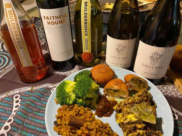 Since traveling to South Africa to visit wineries is not on your Bingo card just yet, you can prepare a feast for yourself featuring South African wines and food which will feel exotic but won’t break the bank or have you work the weekend in the kitchen! Sue came up with an amazing menu, and I selected five South African wines to pair with the meal, a range of wines from Muldersbosch and two South African classics from Lievland, a Chenin Blanc and a pinotage.
