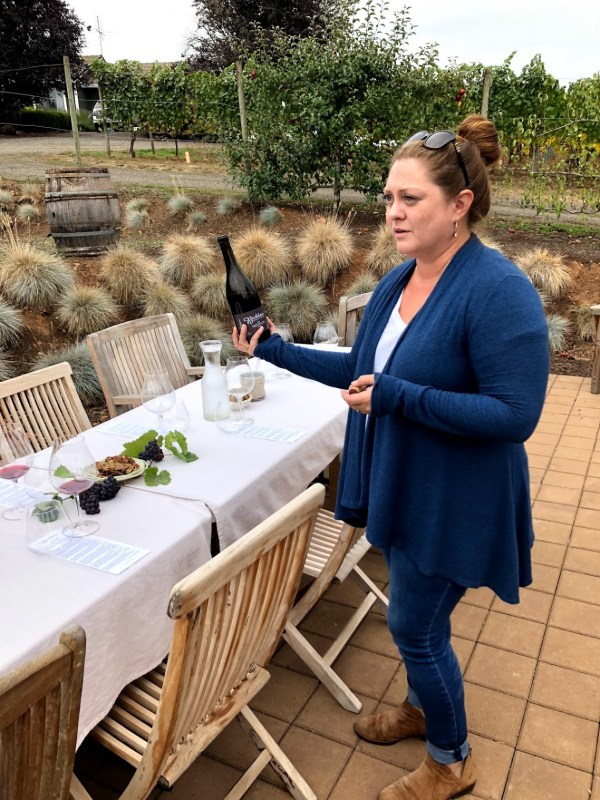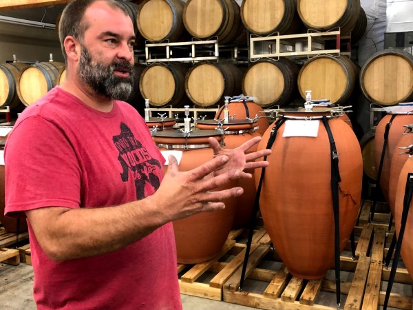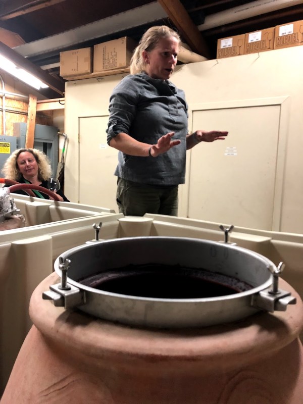 At the Carlton Winemakers Studio in Oregon, Wynne Peterson-Nedry animatedly discusses her amphora wine Sept. 2018