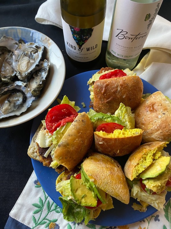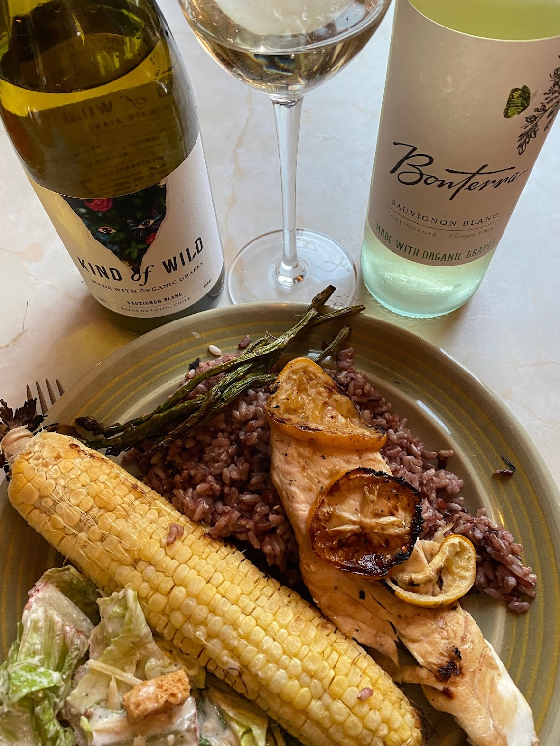 On another evening, I paired these two Sauvignon Blanc with fresh local grilled halibut, a bagged Cesar, grilled corn, grilled asparagus, and aromatic rice. A great pairing, wonderful really, but those sandwiches? I’m salivating just thinking about them! And what a great meal to do for a gathering with friends.