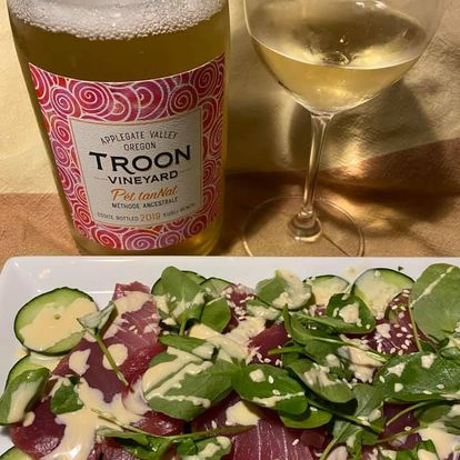 We paired this dish with two wines from Southern Oregon, Troon’s biodynamic Pet tanNat and Weisinger’s skin contact Gewurtraminer. Both wines other texture and body which paired beautifully. We also just enjoyed the sashimi!
