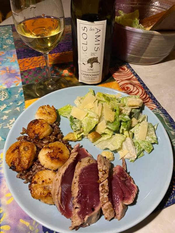 The following night, Marshall seared scallops in garlic, butter, lemon and a bit of wine, then after pulling them off, he dropped a tuna loin onto the hot iron skillet for 30 seconds’ then flipped it so that outside had a hot garlic hit and the inside was cool as a cucumber!