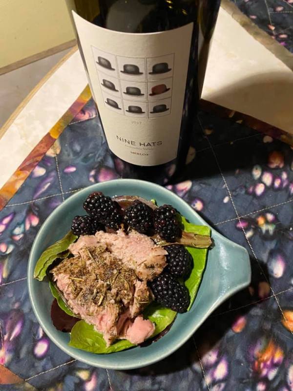 We had another loin so we did one of my favorite, and more unusual tuna pairings: Washington Merlot! Marshall seared and sliced it and then I plated it on a bed of grilled vegetables and greens with blackberries, a strawberry, and with citrus champagne vinegar and sesame oil. But I was so excited I forgot to take photos of the plate, only of the wine! So the next night, Marshall grilled part of the fatty belly on the grill with herbs of Provence and lemon which I plated with greens, blackberries, and good vinegar and oil– oh my! And for my palate, there’s something special about Washington merlot which makes it pair well with rich seafood like salmon and tuna, especially the fatty toro. We’ll be writing more about this wine and pairing for October’s merlot month.