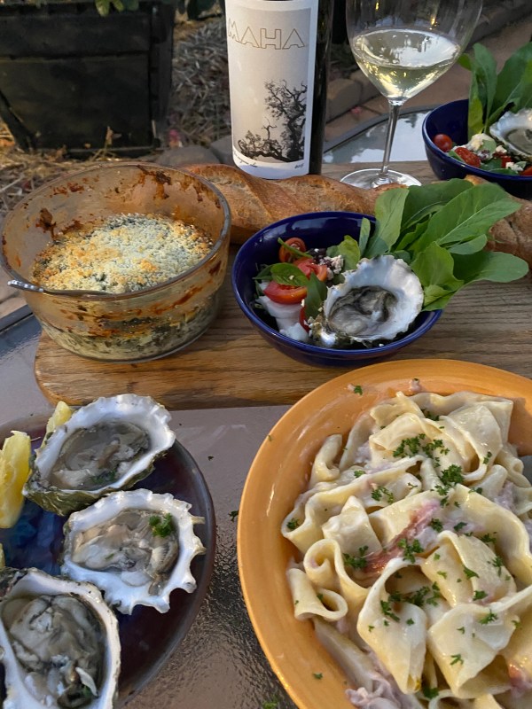 For our next version, Gretel bought fresh pappardelle, Sue dressed it with the Alfredo sauce and tuna, and sprinkled parsley on top. Simply delicious paired with MAHA’s biodynamic Clairette.