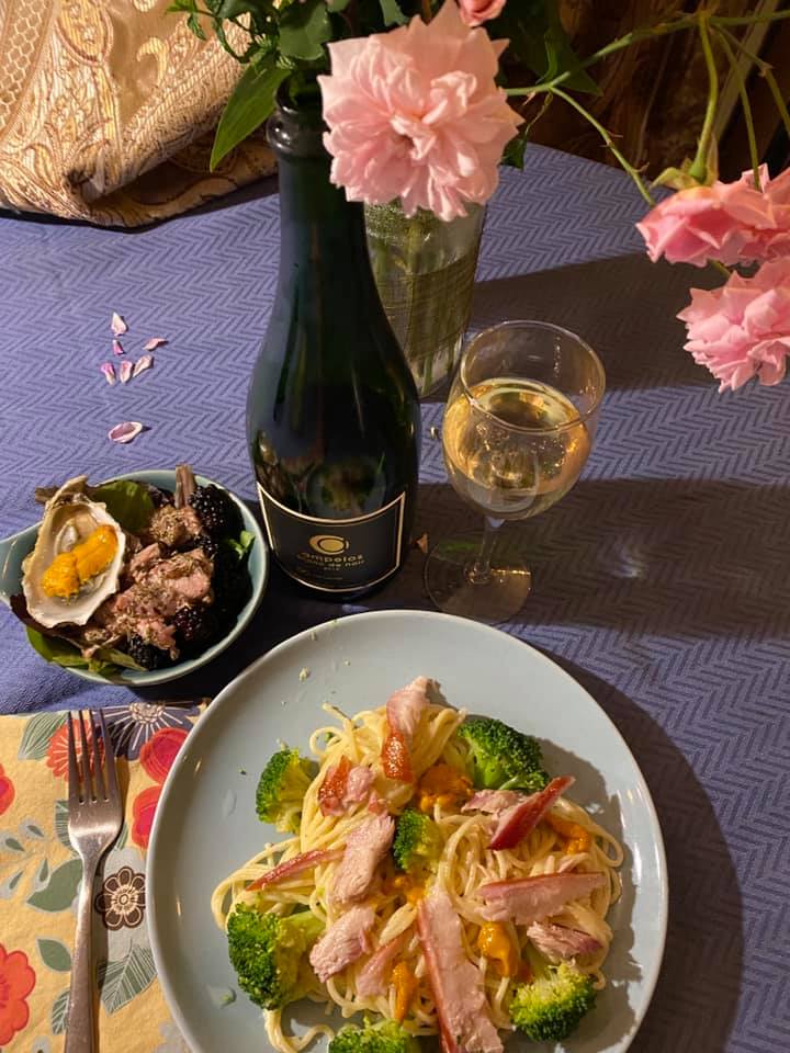 That left us with five fillets to smoke. Marshall did two marinades, and he regrets not marinating them longer. We did two different but similar dishes on two nights with two wines which we paired with the smoked tuna. The first night was spaghetti noodles with Alfredo sauce as a base, then I draped the warm smoked tuna as well as nuggets of UNI. For a salad, Marshall seared the rest of the tuna belly and we did the previous night’s salad again. SO GOOD. Oh, and oysters with uni! The wine? Sparkling biodynamic Ampelos blanc de noir — and I could really taste the pinot noir strawberry and cherry notes in the wine.