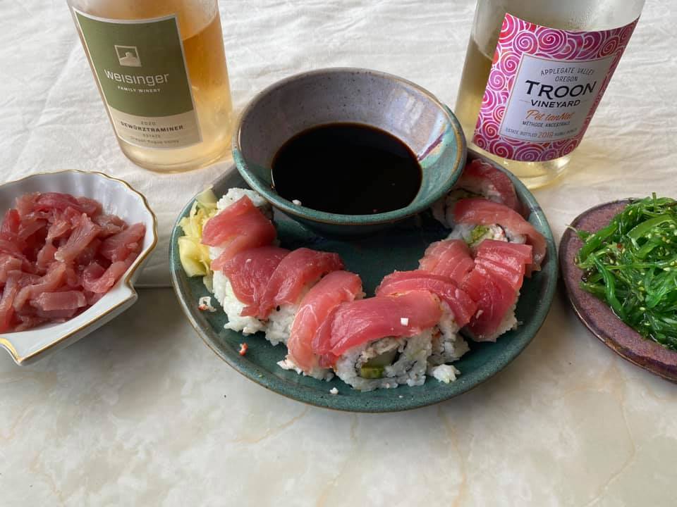 The next day for lunch, I took more of the sashimi and we placed it on “Krab Salad Rolls” I picked up for $5 each at Sprouts, plus a seaweed salad because fisherman Sandy said how much he loves it. That night we enjoyed sashimi too with these wines! I have a lot more to share about these wines coming up soon as I prepare their entries for Slow Wine Guide.