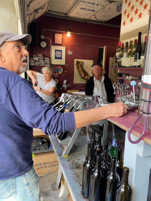 Most of the vineyard was trellised, the grapes unevenly ripe with raisins and green grapes in the same cluster. Bruce chose to do a carbonic maceration with partial whole clusters. I tasted it along the way, and recently, I joined the crew to bottle it, enjoying it while we did so. Truly one of my most favorite zins ever– it’s got quite a zing to it!