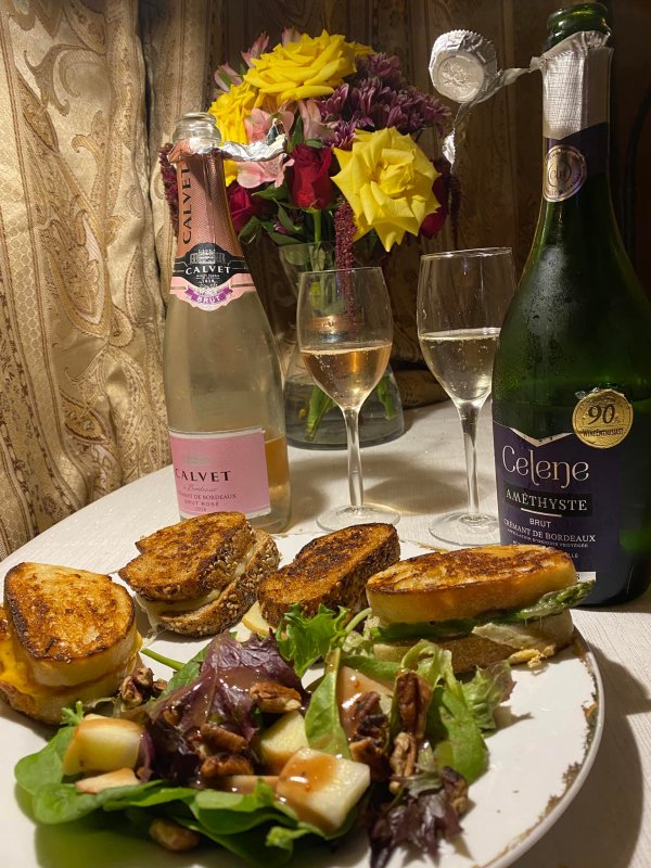 Just like Champagne and other sparkling wines, Crémant de Bordeaux pairs well with food. Thinking about holiday gatherings, we decided to do gourmet grilled cheese. These small sandwiches are, fun, easy, and ideal for a group because they can be made ahead and kept warm in the oven. We also enjoyed a green salad with apple and shrimp sherry she crab bisque we made using fresh seafood I purchased at the local Fisherman’s Market.
